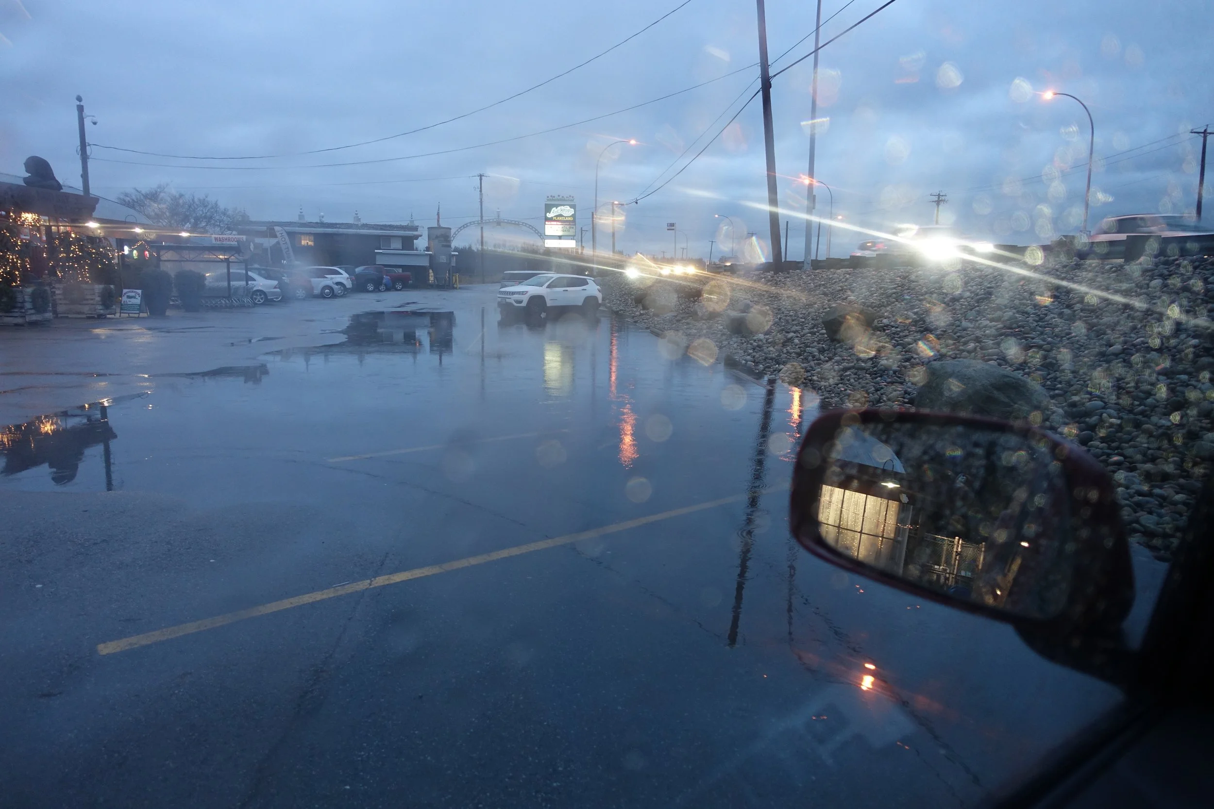 I think the composition helps create a well organized visual statement. There is depth to the photograph, from the car window that is closest to us, to the large, flooded parking lot and the busy highway to the right of frame, to the hills off in the distance. White holiday lights are seen to the left of frame which gives the suggestion of some kind of store featuring holiday goods but it's not overtly in your face. The light of the cars is perhaps a bit too blown out, but this shot was very much grounded in a snapshot aesthetic. It was meant to be quick and dirty. My camera has a RAW and JPG version of this and this is the JPG version right off of the camera, as taken in full auto, no post processing. I took about six or seven photos in this spot, some with the window rolled up, some with the window down. Some with cars passing through the parking lot, and others with no cars driving through the lot like this one. I don't think any of these shots had people in them.