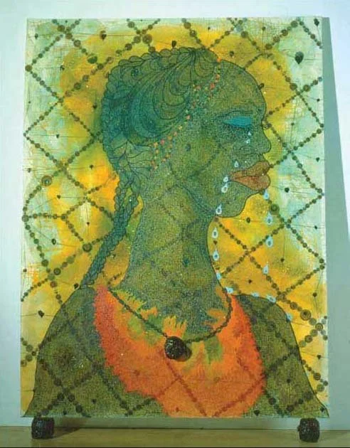 PLATE 3 > Chris Ofili, No Woman No Cry, 1998, acrylic paint, oil paint, resin, pencil, paper collage, Letraset, glitter, map pins and elephant dung on linen with two dung supports, 244 × 183 × 5 cm. (© Chris Ofili. Courtesy of Chris Ofili – Afroco and Victoria Miro Gallery. Tate Photography.)