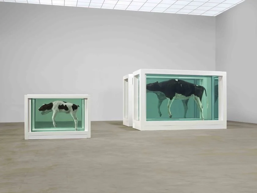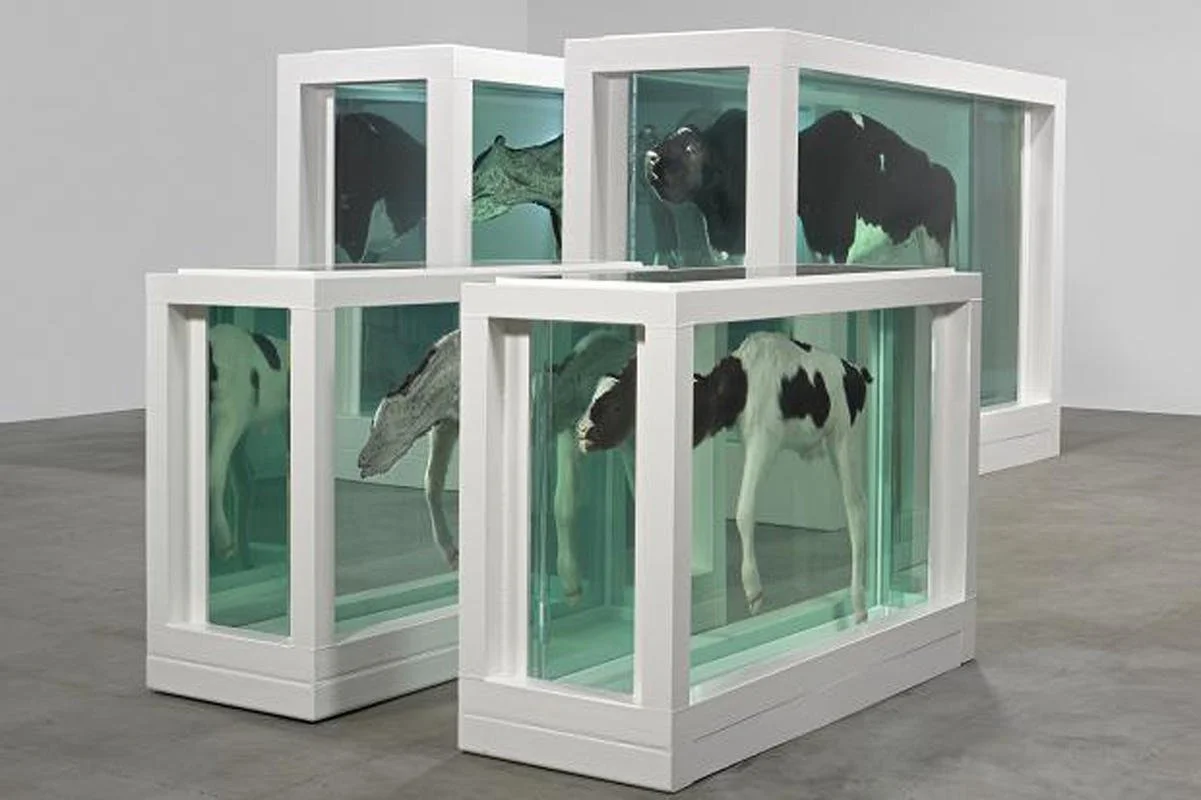 PLATE 10: Damien Hirst, Mother and Child Divided, 1993, steel, GRP composites, glass, silicone sealants, cow, calf, formaldehyde solution, tanks: 190 × 323 × 109 cm and 103 × 169 × 63 cm. (© The artist. Courtesy Jay Jopling/White Cube, London.)