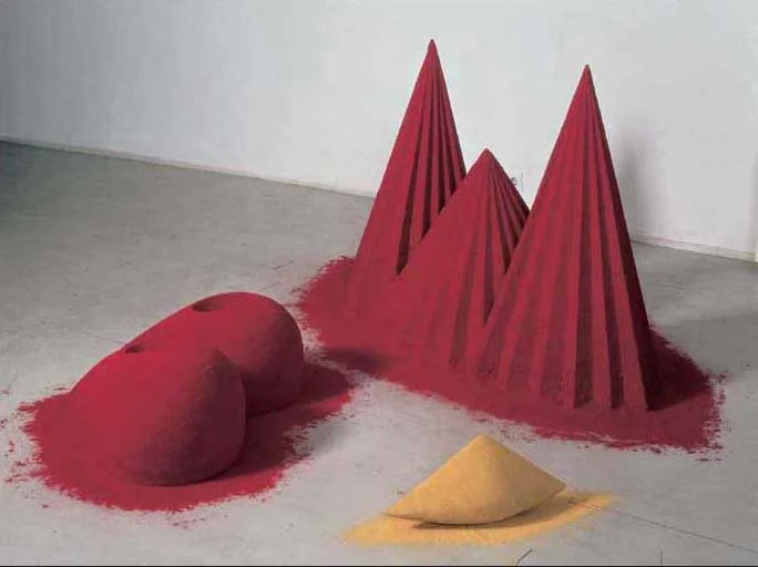 First Impressions: Otherworldly. Sandcastles - fragility. Dust, possible crumbling of the structures. Primary Colours - red, and yellow. Round / Curved shapes - contrasted with Triangle / Cones / Sharp Spike shapes. Two of the red shapes are rounded, three are cones, the yellow shape is cone and rounded. Placed on a concrete floor in front of a white wall. Feels like an industrial setting.