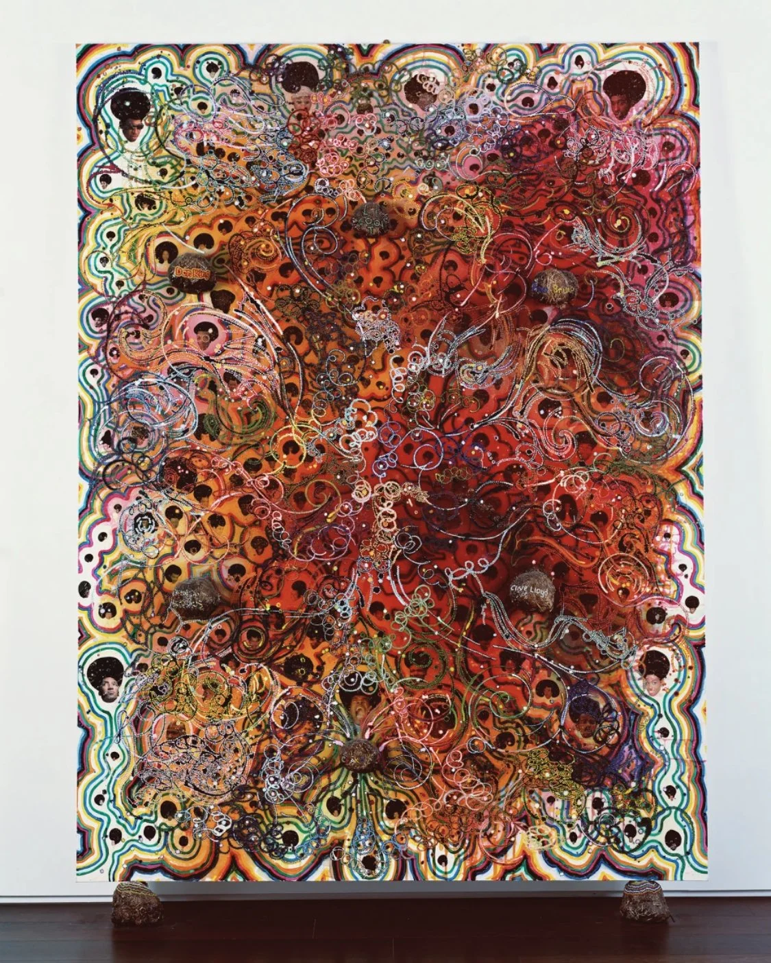 PLATE 8: Chris Ofili, Afrodizzia, 2nd version, 1996, acrylic, oil, resin, paper collage, glitter, map pins and elephant dung on canvas with two dung supports, 244 × 183 cm. (© Chris Ofili. Courtesy of Chris Ofili – Afroco and Victoria Miro Gallery.)