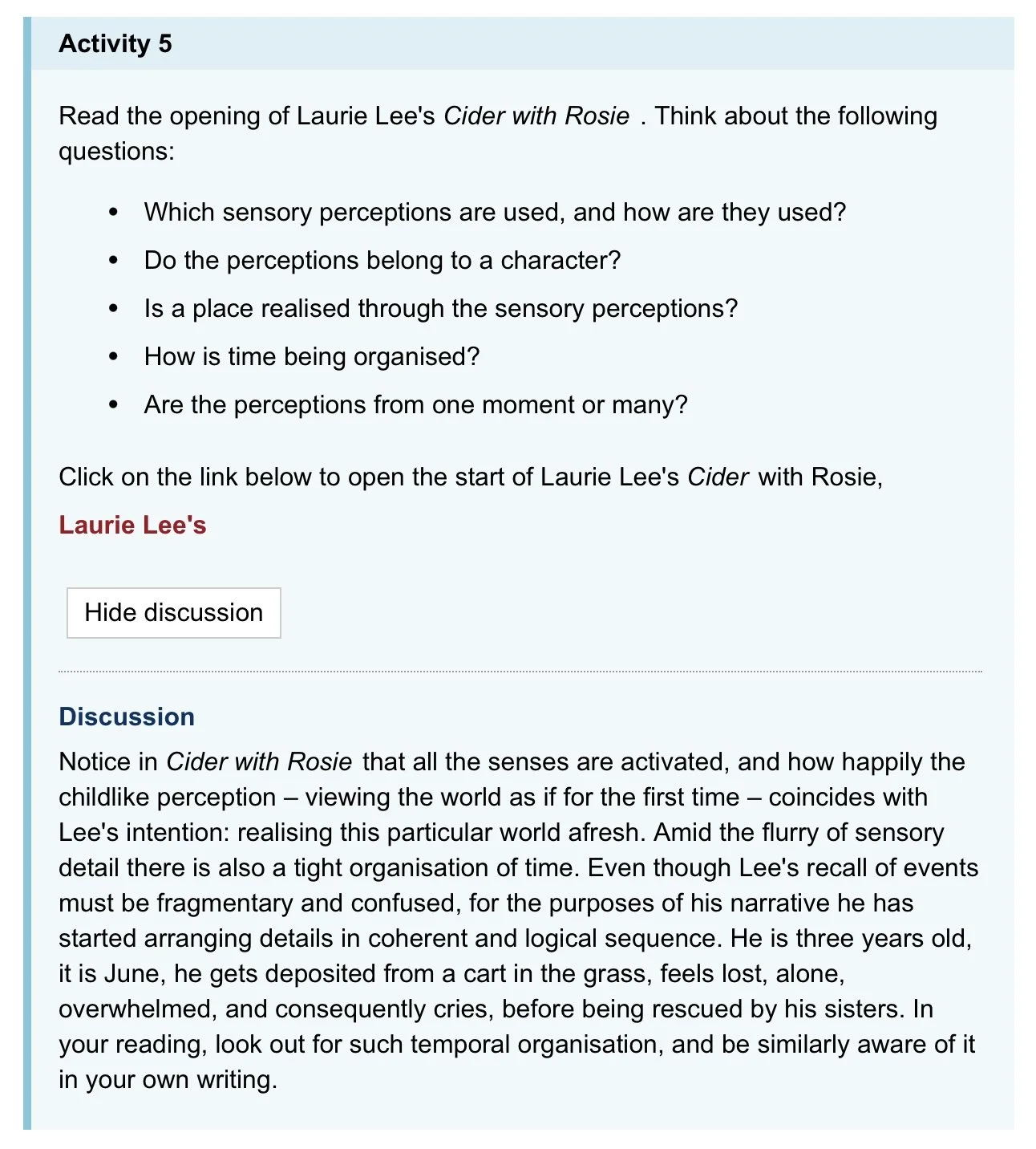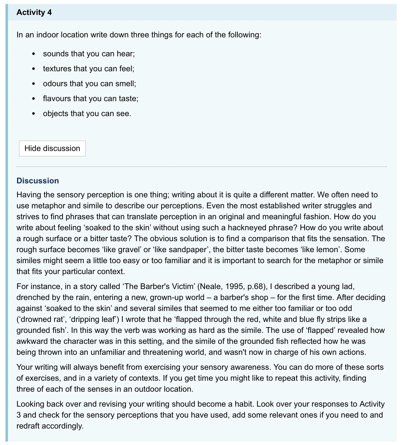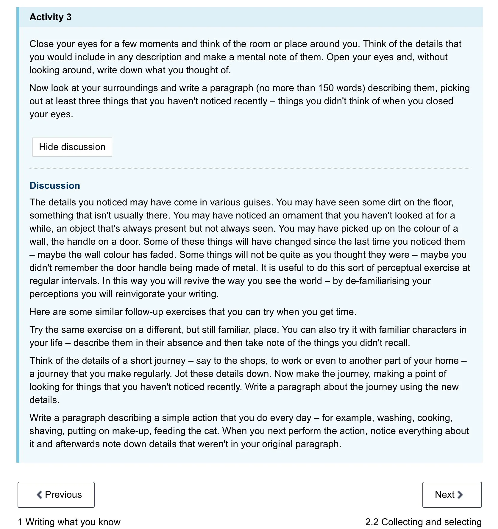 “It is these shifts in the way ou see your familiar world that revive it. In this way writing is a process of scrutinizing, looking closely at things, and then taking the observations onto a new level of perception, one in which you understand your world just a little more… Whether apparently insignificant or more focused, there is no prescription for the sort of observations you should make; they will always be personal to the individual writer.”